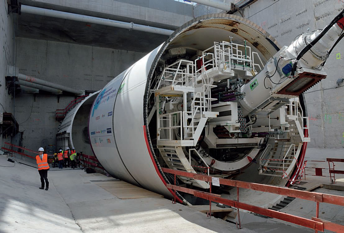 Première étape, prolonger et adapter le réseau de métro actuel. Ce sont donc les lignes 11 et 14 Le tunnelier qui sont concernées, désormais totalement intégrées au GPE. La ligne 11 est sans doute la moins préparée à ce saut dans la modernité. Ouverte en 1935 entre Châtelet et Porte-des-Lilas, elle est prolongée dès 1937 vers Mairiedes- Lilas en attendant de pousser vers Romainville, une extension décidée dès 1929 et restée dans les cartons jusqu’à aujourd’hui. Cette courte ligne (6,3 km) n’a connu jusqu’à présent qu’un trafic relativement réduit (environ 230 000 voyageurs par jour). Ses trains de quatre voitures n’occupent pas toute la longueur des 75 m de quais. Première ligne à roulement sur pneus depuis 1956, elle est équipée de rames MP 59, qui accusent leurs 50 ans d’âge. En 2022, elle sera prolongée de 6 km avec six stations en direction de Rosny-Bois-Perrier, en correspondance avec le RER E. En seconde phase, la ligne va pousser jusqu’à la gare de Noisy-Champs, où elle sera en correspondance avec le RER A et les lignes 15 et 16 du GPE.