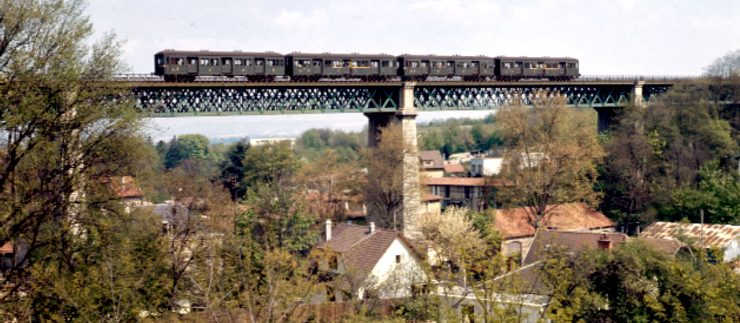 • de Marly-le-Roi sur la ligne L du Transilien (branche Saint-Nomla- Bretèche), à treillis par-dessous, en fer puddlé, long de 282 m, haut de 30 m, au-dessus d’une zone habitée, dont le renouvellement avec un tablier mixte fer-béton construit à côté demandera deux ans et demi ;