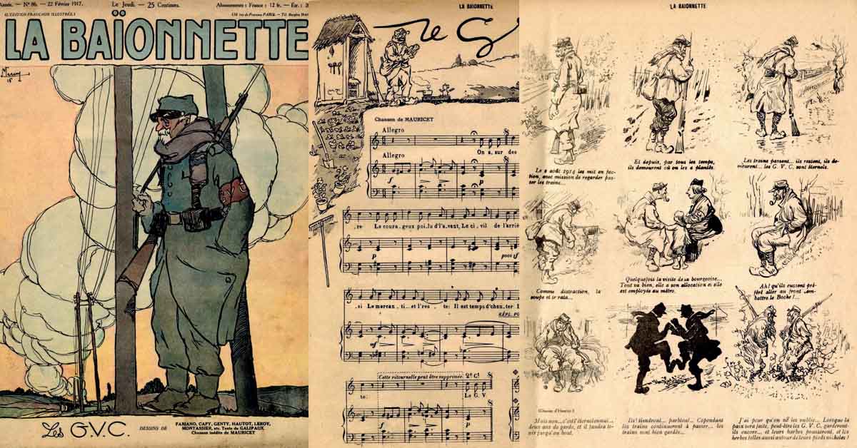 Le voici donc représenté en pleine page sur la couverture de ce numéro spécial de La Baïonnette consacré aux GVC. L’hebdomadaire satirique est créé en janvier 1915 par Henri Maigrot, dit Henriot (1857-1933), illustrateur et ancien directeur du journal Le Charivari. Sur un ton caricatural, la publication ridiculisait l’ennemi pour soutenir le moral des Français en évoquant la guerre sous différents angles. Elle employa de nombreux illustrateurs et caricaturistes tels que Marcel Capy, Francisque Poulbot, Charles Léandre ou Albert Robida et souhaita garder, jusqu’à la cessation de sa parution en 1920, une orientation familiale et de bon ton.