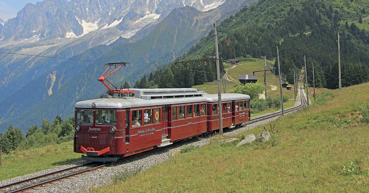 Le dimanche 26 septembre, la saison d’été s’est achevée pour le Tramway du Mont-Blanc avec une petite émotion. En effet, les trois automotrices Anne, Marie et Jeanne du TMB ont effectué leur dernière ascension jusqu’au Nid-d’Aigle à 2 372 m d’altitude. Ces trois machines sont en service depuis 1957 et seront remplacées pour la saison estivale 2022 par trois nouvelles automotrices modernes aux couleurs identiques qui porteront les mêmes prénoms que les précédentes. Les nouvelles machines sont en cours de construction dans les ateliers suisses de l’entreprise Stadler. Sur cette photo prise le 11 juillet 2020, on voit l’automotrice Jeanne entre Bellevue et Col-de-Voza dans un décor exceptionnel d’altitude descendant du Nid-d’Aigle et du mont Lachat.